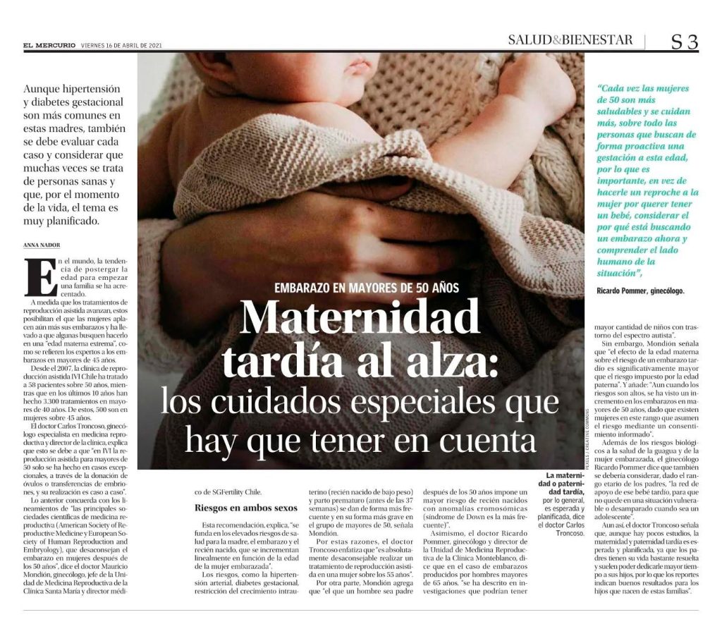 Dr. Mauricio Mondion comenta en el Mercurio sobre Maternidad tardía